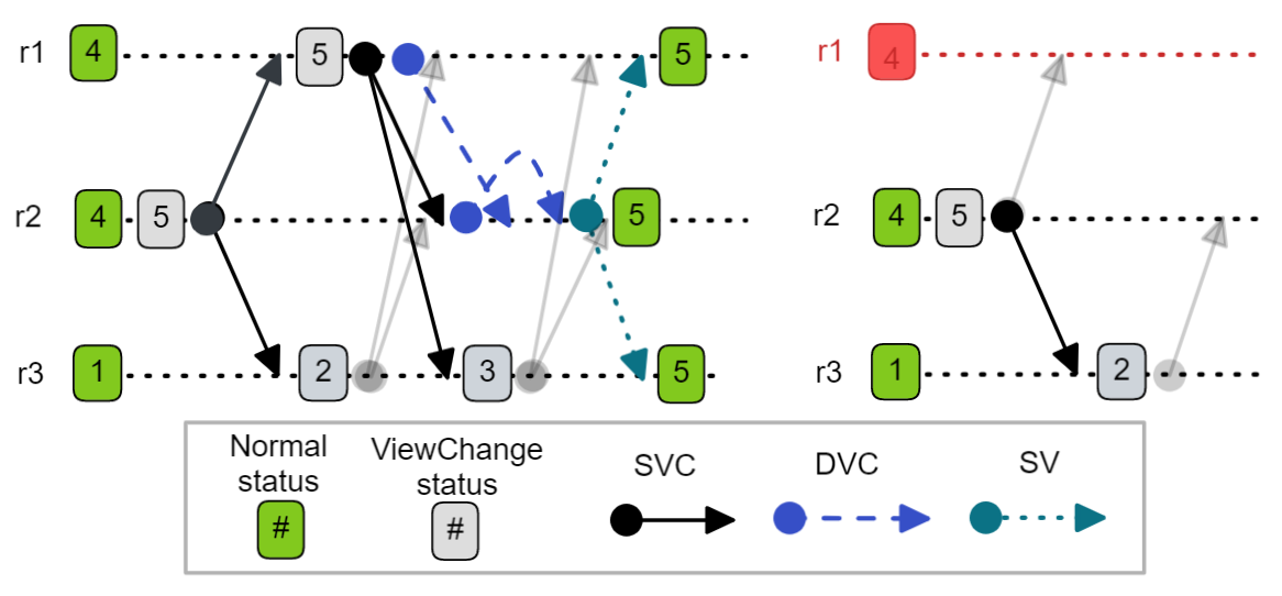 Fig 4. Two view changes with a stale view number. The left example can complete despite r3 being ignored, the right example shows a view change getting stuck.