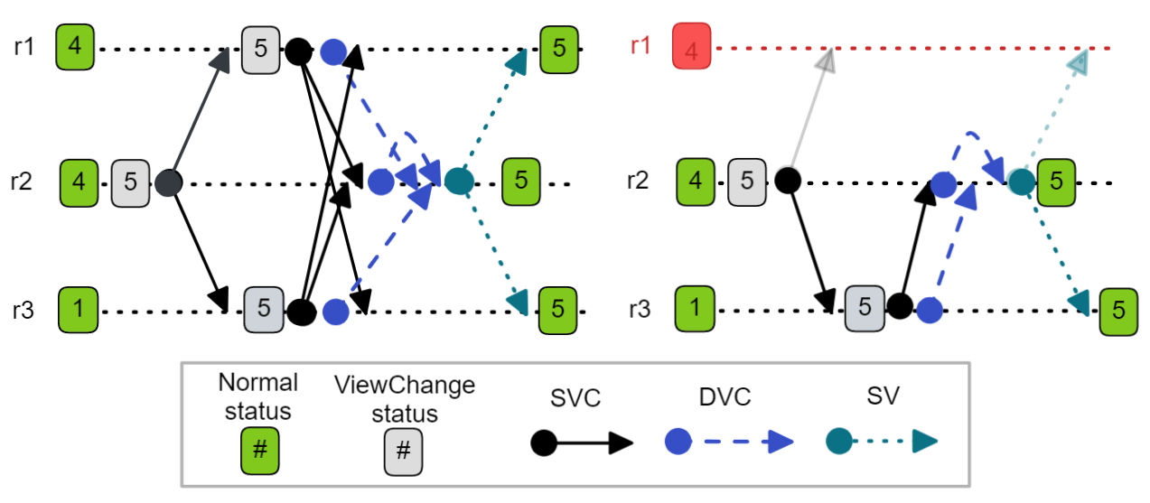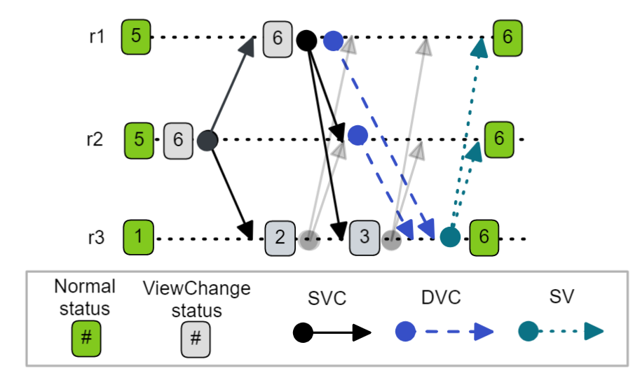 Fig 1. StartViewMessage (SVC) flood after r1 triggers a view change.