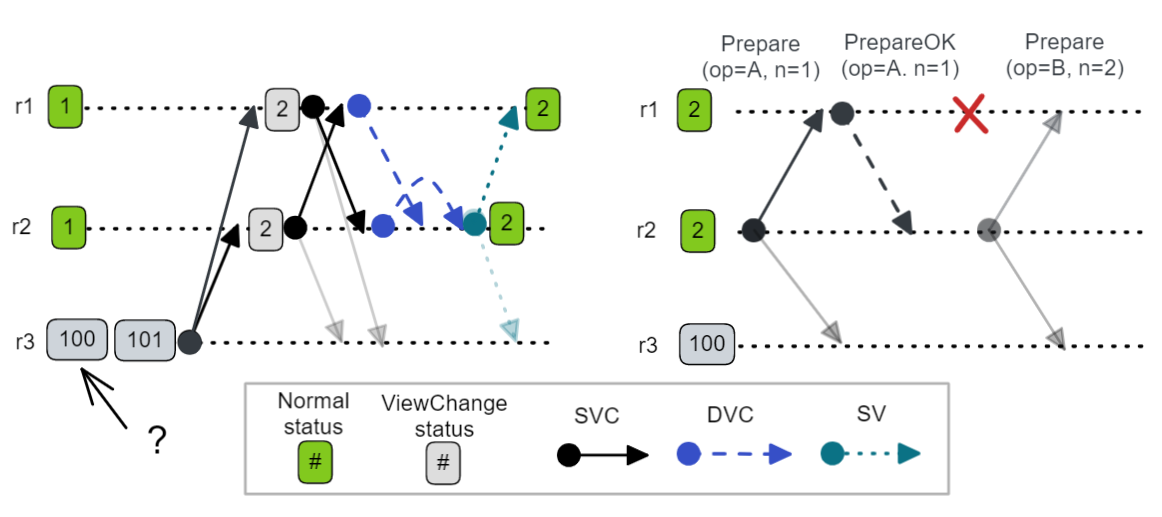 In the right example r3 ignores Prepare messages because the view number is too low (and the replica will be in ViewChange status still). When r1 becomes unavailable, despite there being two available replicas, the cluster cannot make progress - as bad a liveness issue as it gets.