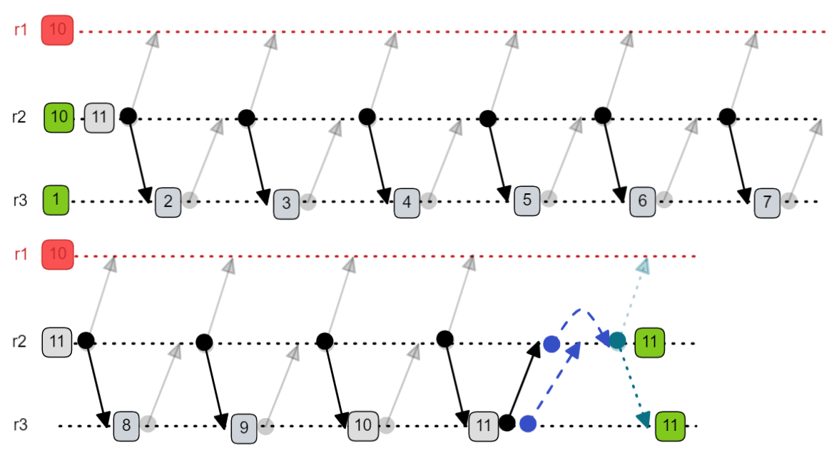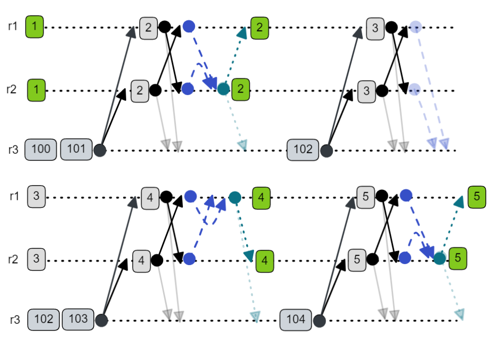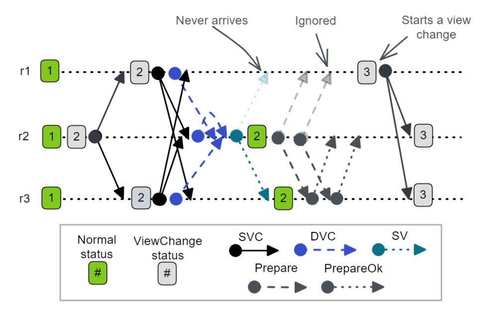 It’s worth noting here that VR Revisited has a mechanism called State Transfer that enables a replica to catch up if it has a stale view. However, state transfer only works if there is a functioning replica in the normal status. Looking at the above history, if r3 sends a GetState message to r2 with view 11, r2 would ignore it because r2 is in the ViewChange status. The only way for r3 to catch up in this scenario is for it to follow the history above where it increments its way to view 11.
