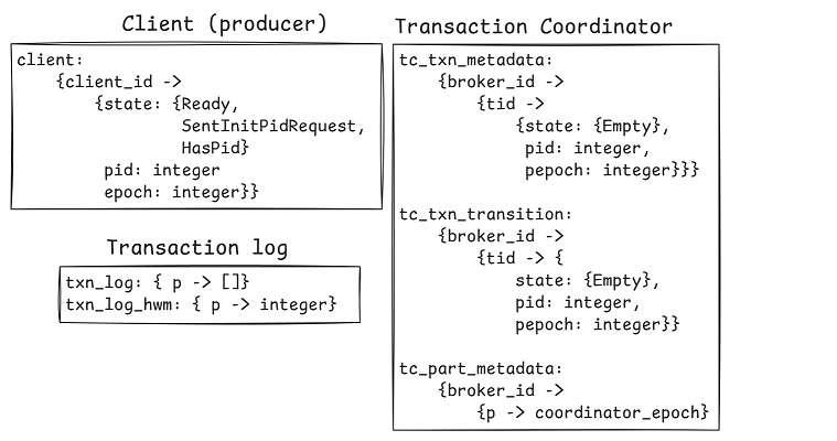 How do I represent the transaction log? Remember that the transaction log is a Kafka topic. I wrote the Kafka replication protocol spec, which is large and complex. Do we want to extend that spec to include transactions? No. It would be too big, complex and the state space would be impractical. Instead, I will use the powers of TLA+ to choose my abstractions. I decided to represent each transaction log partition as a simplified abstraction of an unreplicated log (a TLA+ sequence), that mimics the external visible properties of a Kafka topic (durable, ordered, high watermark (HWM) is monotonic).