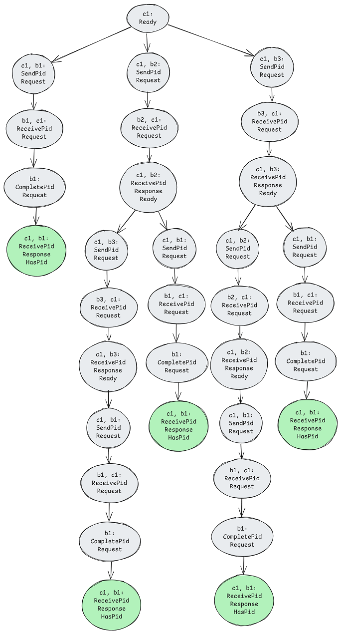 If the model checker finds a history where a client never obtains a PID, then the liveness property gets violated. This is great because initially, specs usually have a number of bugs that prevent the model checker from reaching valid reachable states. This was the case with this spec, I had a few silly bugs that prevented clients from reaching the HasPid state. The lesson here is that liveness properties make for good tests.