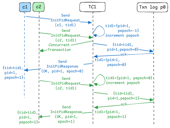 CASE 2 - Existing TID metadata exists, and no pending transition exists. It reuses the existing PID and increments the producer epoch and sends an OK InitPidResponse.