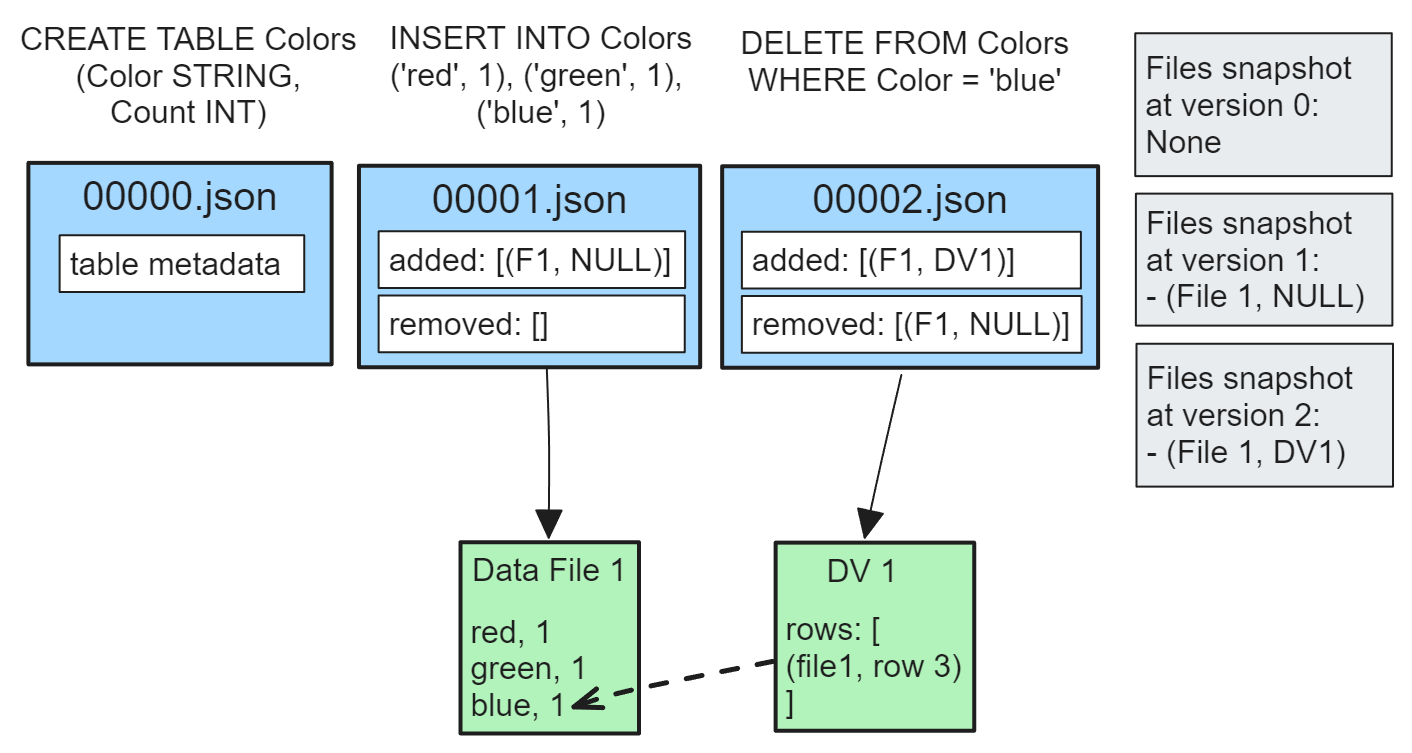 Write the log entry 00002.json to the delta log. Added files = [(”datafile1.parquet”, “dv1.bin”)], removed files = [(”datafile1.parquet”, NULL)].