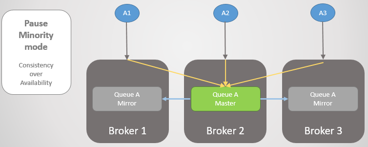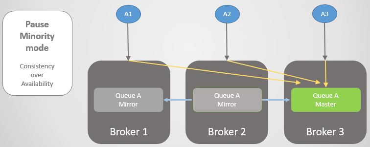 Broker 3 comes back online and new mirrors are created. The Queue A master starts replicating its existing messages to the new mirror and during this time the queue is unavailable. It takes two hours to replicate the data causing two hours of downtime for that queue!