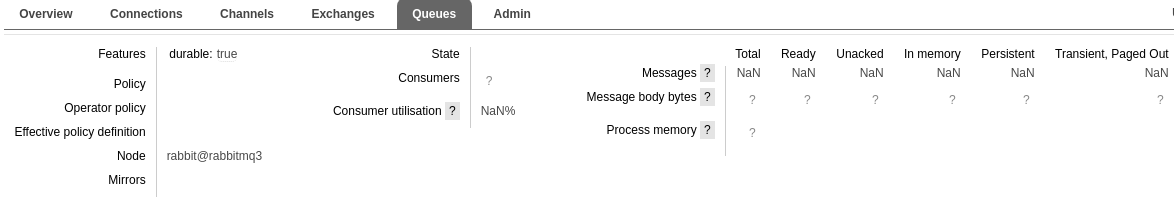 Notice how there are no mirrors anymore? At this point we can’t even use the rabbitmqctl tool to promote a mirror, the mirrors are no longer recognized.