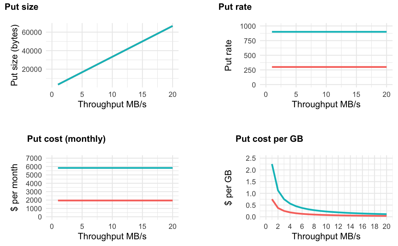 The principal weakness of S3 Express One Zone for a low-latency log is the cost-effectiveness at low to medium throughputs. Given there is a cost penalty to sending requests larger than 512KB, the main cost-driver is the request rate.