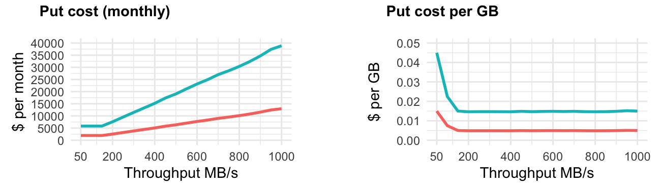 Last year I wrote a Java program that I use to simulate the hardware resource needs (and costs) of State-Machine-Replication (SMR) workloads. For this analysis I wrote a new one for an S3 Express One Zone log. They spit out CSV files which I then run through some R notebooks. I may make time to clean them up for general consumption, but these calculations can all be done with a spreadsheet, using the pricing formulas available in AWS. It would be great to release a polished cost model, but that is a lot of work, and I don’t want to be responsible for other people’s cost calculations. Not to mention that discounts schemes can often make a general purpose model way too complex to build.