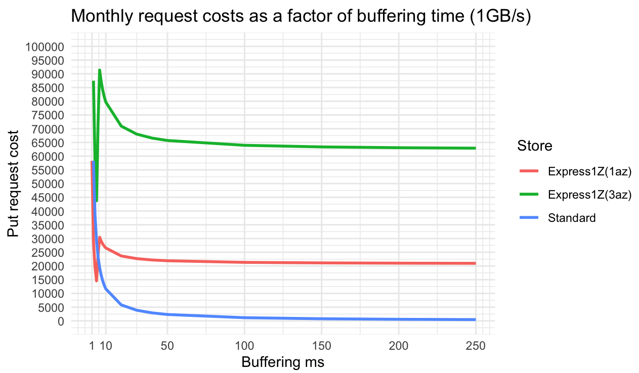 What is interesting is the impact of buffering time and request size on S3 Express One Zone. At 1 MB/s, it is clearly more economical to buffer for 100ms, this is because this reduces the request rate while still keeping the request size <= 512 KB. However, at some point there is a crossover where buffering for 100ms makes the economics worse. We see this at the 500MB/s and 1 GB/s workloads where the long buffering creates 10 MB request sizes.