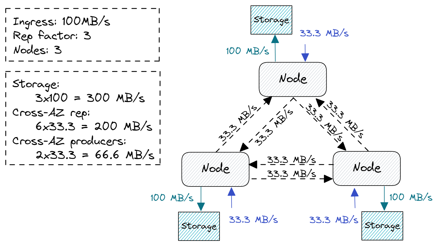 For example, given 3 nodes, a replication factor of 3 and an aggregate ingress of 100 MB/s, we get: