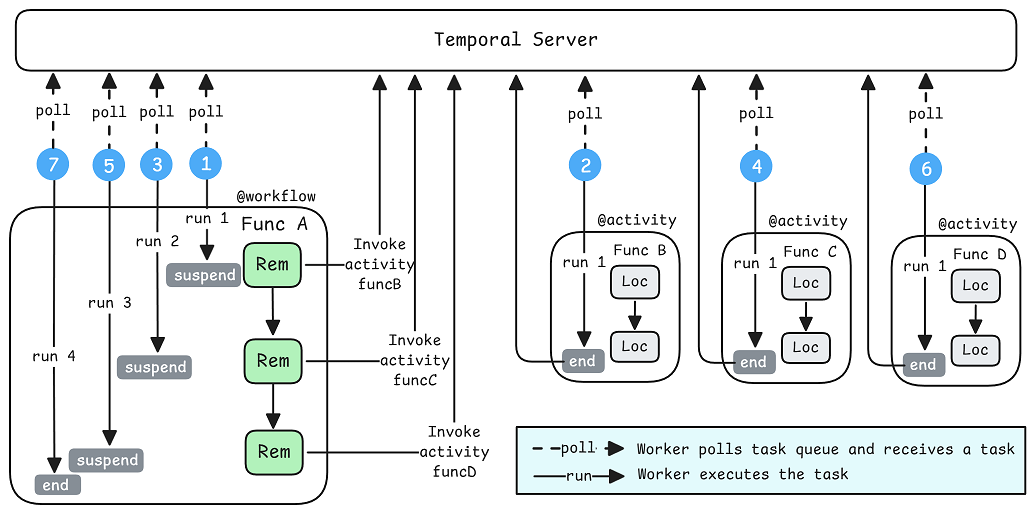 Fig 5. Workers poll Temporal Server task queues for tasks, and then execute those tasks. Activity are invoked via commands which Temporal Server derives events and tasks from.