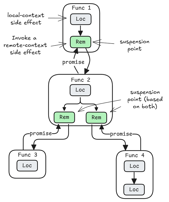 The distinction between local and remote matters because remote-context side effects create natural suspension points, which become important for durable function trees.