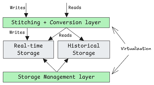 A virtualization layer can present a simple, unified API that stitches together different physical storage systems and formats behind the scenes. For example, the data may exist across filesystems with a row-based format and object storage in a columnar format, but the application layer sees one unified logical model.