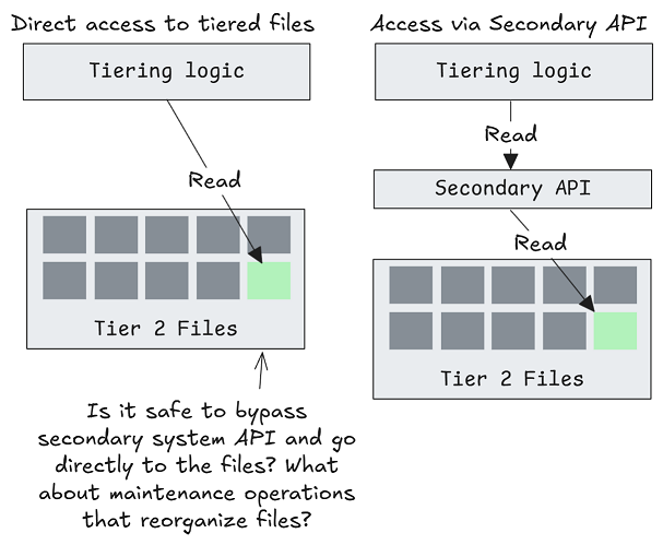 The direct-access strategy could be problematic for shared tiering as it bypasses the secondary system’s API and abstractions (violating encapsulation leading to potential reliability issues). The biggest issue in the case of lakehouse tiering is that table maintenance might reorganize files and delete the files tracked by the primary. API-access might be preferable unless secondary maintenance can be modified to preserve the original Parquet files (causing data duplication) or have maintenance update the primary on the changes it has made so it can make the necessary mapping changes (adding a coordination component to table maintenance).