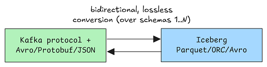 Schema management. Schema evolution of the primary format (such as Avro or Protobuf) may not match the schema evolution of the secondary format (such as Apache Iceberg). Therefore, great care must be taken when converting from the primary to the secondary format, and back again. With multiple primary formats and multiple secondary formats, plus changing schemas over time, the work of ensuring long-term bidirectional compatibility should not be underestimated.