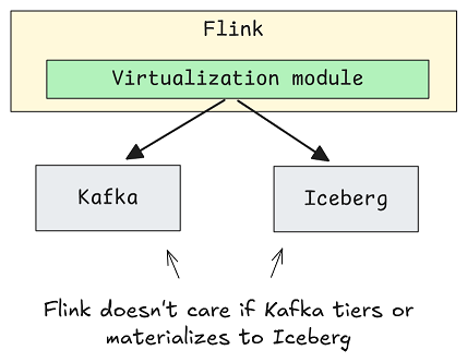 We might be using Flink and want to combine real-time Kafka data with historical lakehouse data. Flink sits above the high-level APIs of the two different storage systems. Whether the Kafka and lakehouse data are tightly lifecycle-linked with tiering, or more loosely with materialization is largely unimportant to Flink. It only needs to know the switchover point from batch to streaming.